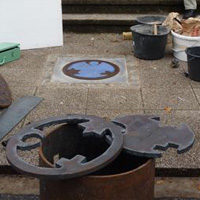 Weiter geht es - vorbei an der Zeche Zollverein - zum Schulhof der Richard-Schirrmann-Realschule, wo wir schon erwartet werden im Rahmen des Schulfestes zum 55. Schuljubiläum. Hier verlegen wir die Bodenintarsie des Engels der Kulturen und brennen gemeinsam mit einigen Schülerinnen und Schülern das Zeichen für die nächste Stadt aus.