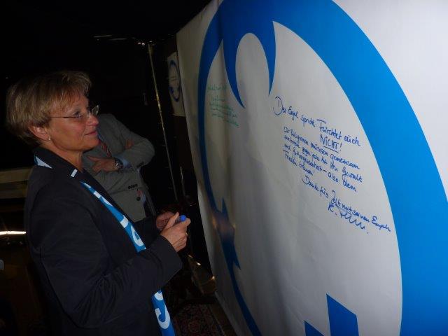 Im Anschluß an die Kunstaktion findet in der Kirche ein interreligiöses Brotbrechen und gemeinsamer Gottesdienst von Juden, Muslimen und Christen statt.