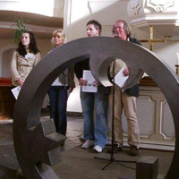 Am Vormittag führen wir gemeinsam mit SchülerInnen und LehrerInnen des Berufskollegs die Aktion mit der rollenden Skulptur in der Wuppertaler Innenstadt durch. Wir starten an der Wupperfelder Kirche, gehen dann zum Rathaus, weiter zur Synagoge, zur Kirche St. Antonius und zur DITIB-Moschee. An jeder Station wird an diesem Morgen ein temporäres Sandbild des Engels der Kulturen gelegt. Die Glaubenseinrichtungen hatten einige der SchülerInnen schon vorher im Zusammenhang mit ihrem Projekt „Gott in Wuppertal – Weg der Hoffnung“ aufgesucht, um die Gemeinsamkeiten und Unterschiede der 3 abrahamitischen Weltreligionen zu erforschen.